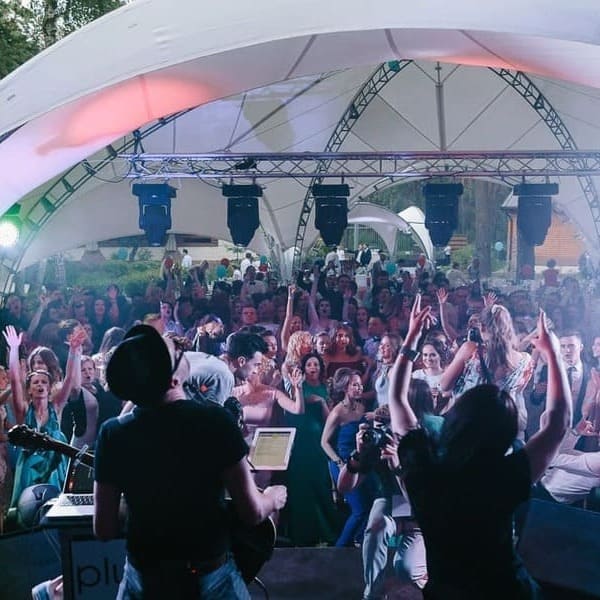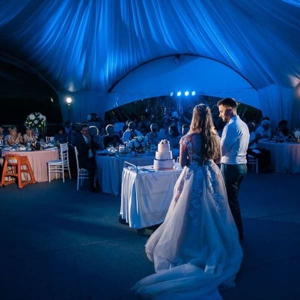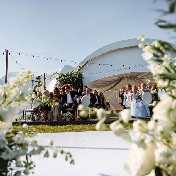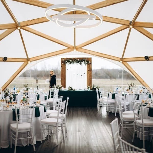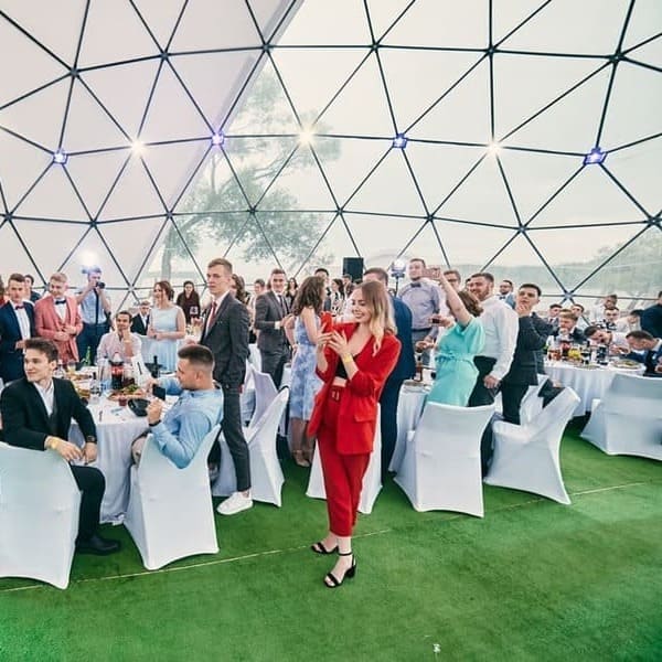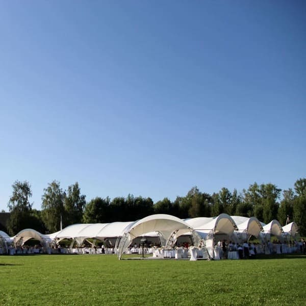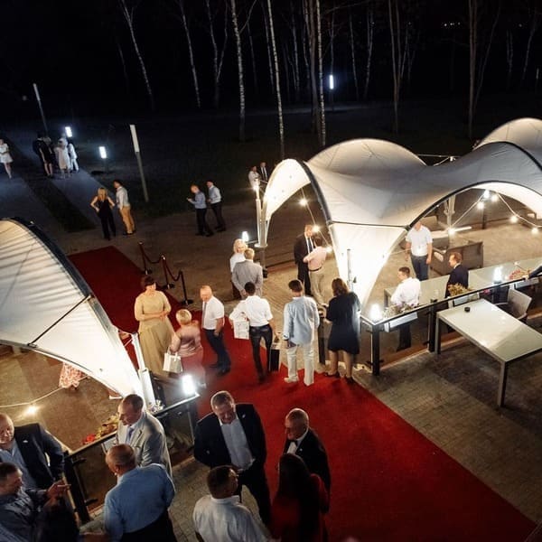 Prostorné a elegantní venkovní svatební pavilony nejenom nahrazují restaurace, ale také umožňují pořádání oslav téměř na jakémkoli místě, přičemž zaručují krásné a pohodlné prostředí pro všechny hosty. Lehké a vzdušné struktury pavilonů vytvářejí dovolenkovou atmosféru a ideální místo pro venkovní svatební obřad, který se po slavnostním aktu promění na taneční parket, hostinovou síň a fotografickou zónu. Pavilony pojme libovolný počet hostů, zatímco klimatizační a ventilační systémy zajistí jejich pohodlí.