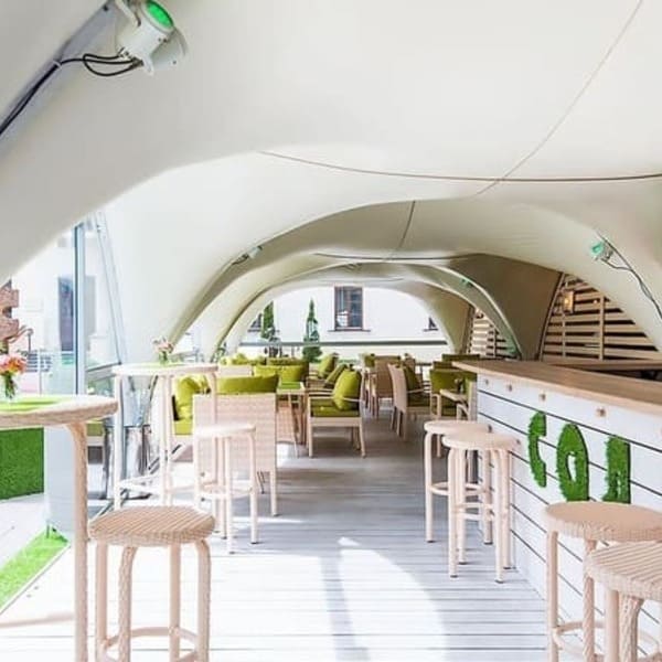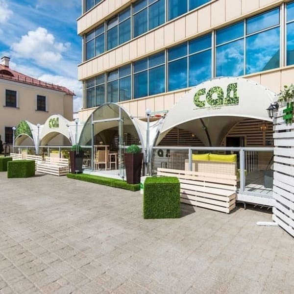Nabízíme moderní a stylová řešení pro restaurace a pouliční kavárny, včetně stínících stánků pro terasy, baldachýnů, vstupních hal a pavilonů pro letní kavárny a terasy na střechách nebo vyšších patrech budov. Naše konstrukce z lehkých a odolných materiálů umožňují rychlou montáž a tvorbu různých tvarů a designů teras a přístřešků. Dále nabízíme možnosti jako je tisk loga na fasádu, montáž podlahy, vybavení interiéru, včetně neobvyklého osvětlení a klimatizačního systému.